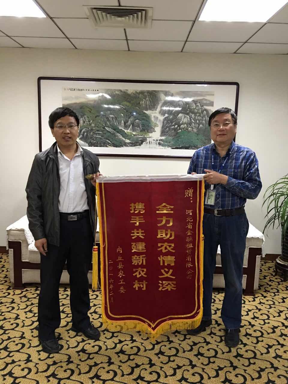 一年來(lái),河北金租駐村工作隊(duì)與孫家坡村的干部群眾打成一片。在省市黨組織部門的抽查、突查中均未出現(xiàn)漏崗,中秋節(jié)、元旦等假日也堅(jiān)守崗位,受到省國(guó)資委領(lǐng)導(dǎo)、各級(jí)扶貧辦和村民的一致好評(píng)。駐村工作隊(duì)榮獲內(nèi)丘縣扶貧辦、農(nóng)工委頒發(fā)的“2015年度扶貧工作先進(jìn)集體”稱號(hào),工作隊(duì)曹津生榮獲“2015年度扶貧工作先進(jìn)個(gè)人”稱號(hào)。近日,內(nèi)丘縣農(nóng)工委特向公司贈(zèng)送一面錦旗,表達(dá)了“全力助農(nóng)情誼深,攜手共建新農(nóng)村”的感謝之情。